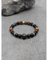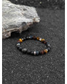 Bracelet Agate Noire Dépolie, Trois Œil (Œil de Tigre, de faucon et de taureau) de 8mm de diamètre et perle de Tahiti Gravée à la main.