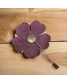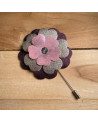 Fibule forme fleur, en cuir aux teintes pourpre, argenté et rose.